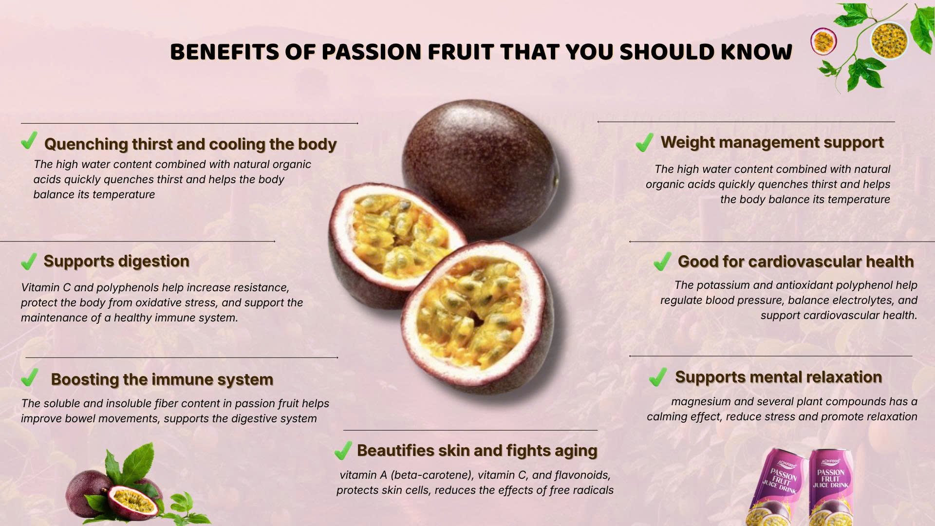 Passion fruit has long been a familiar part of daily life, commonly enjoyed in refreshing beverages, desserts, or simply as a distinctive flavor. Originating from South America, this tropical fruit is now widely cultivated in countries such as Vietnam, Brazil, and across Southeast Asia, highlighting its global popularity. Characterized by a dark, firm rind, juicy flesh filled with small seeds, and a signature sweet-and-sour taste, passion fruit not only delivers an instant thirst-quenching sensation but also offers a variety of notable health benefits—making it an ideal choice for modern, health-conscious lifestyles.