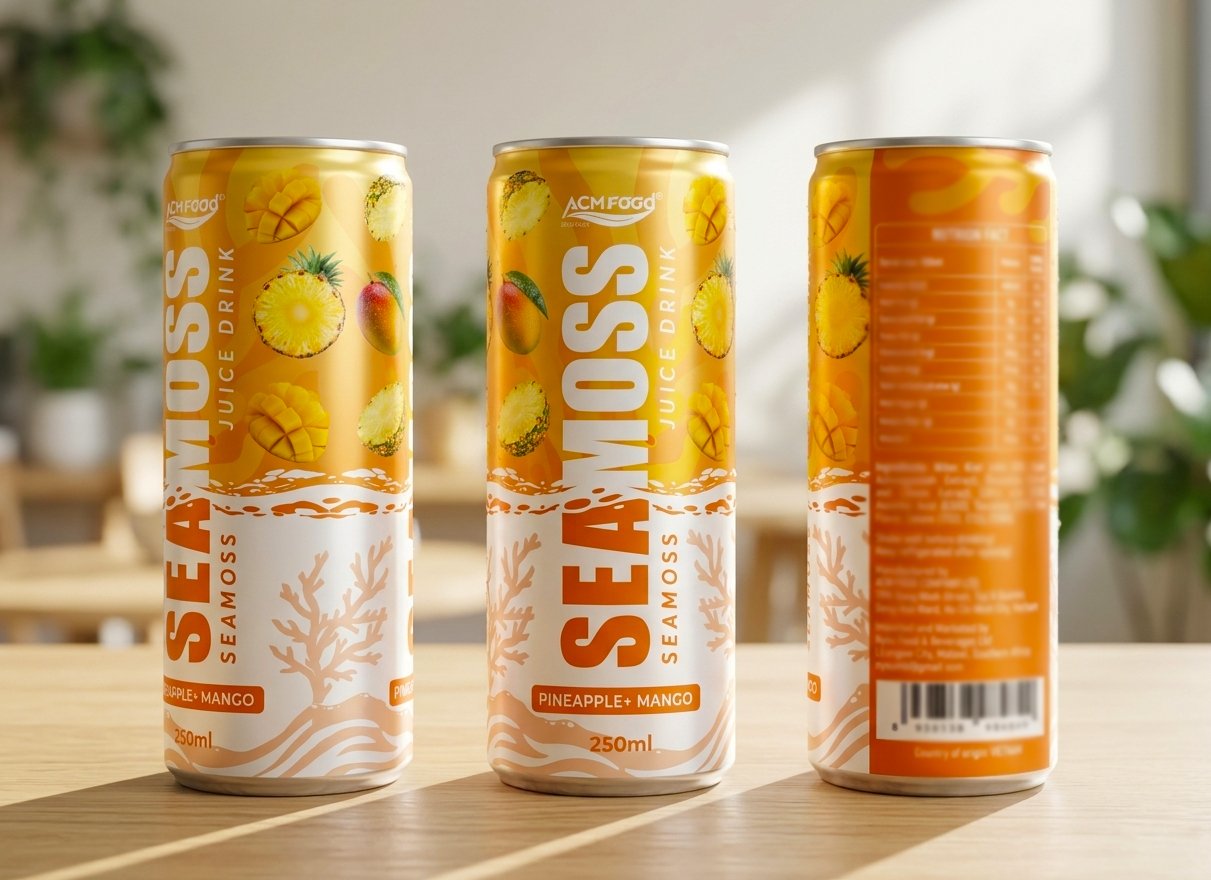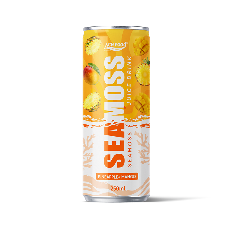 Export-ready sea moss juice with mango and pineapple in 250ml alu-cans. Functional beverage solution for international distributors seeking tropical wellness products with OEM capabilities.