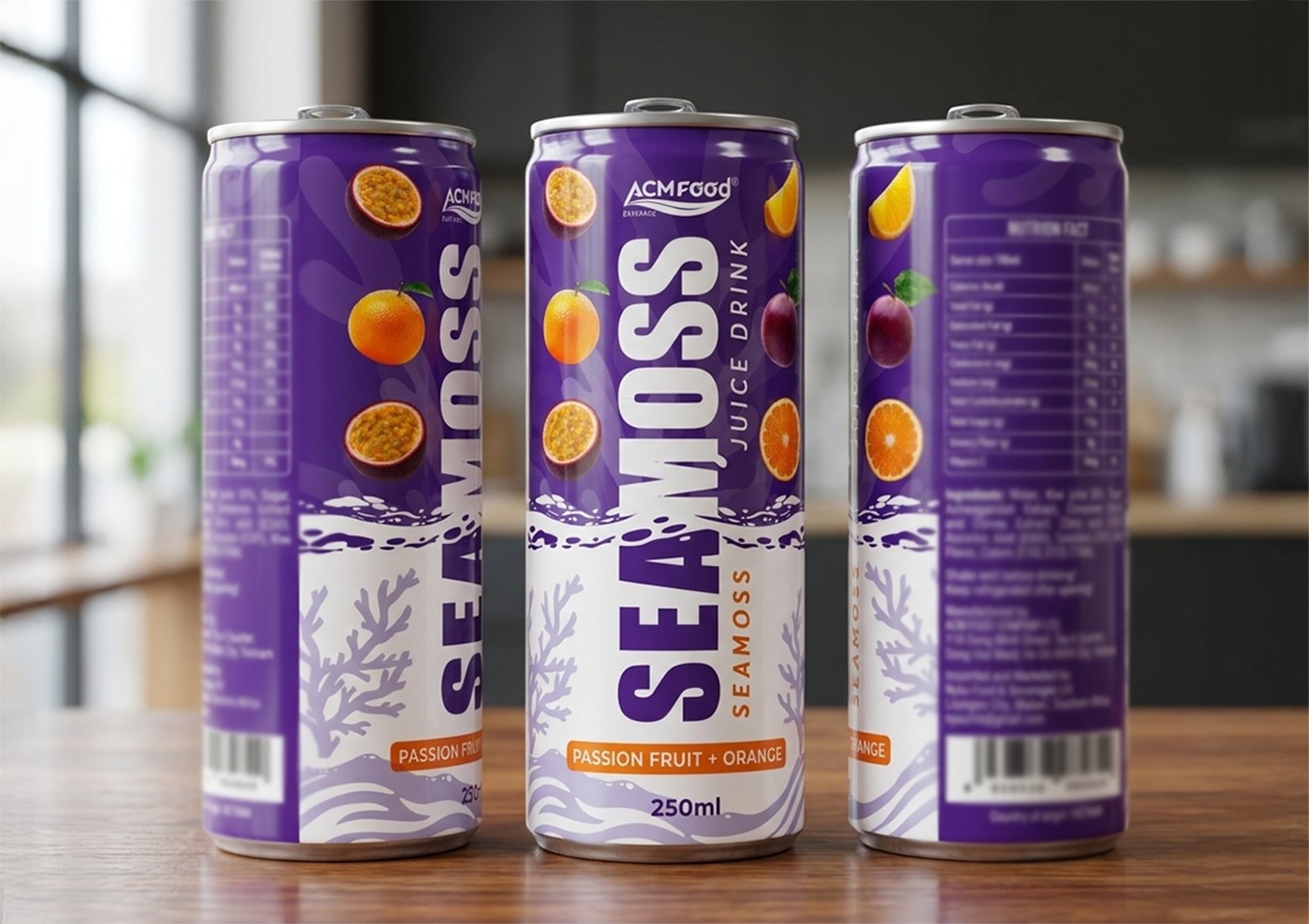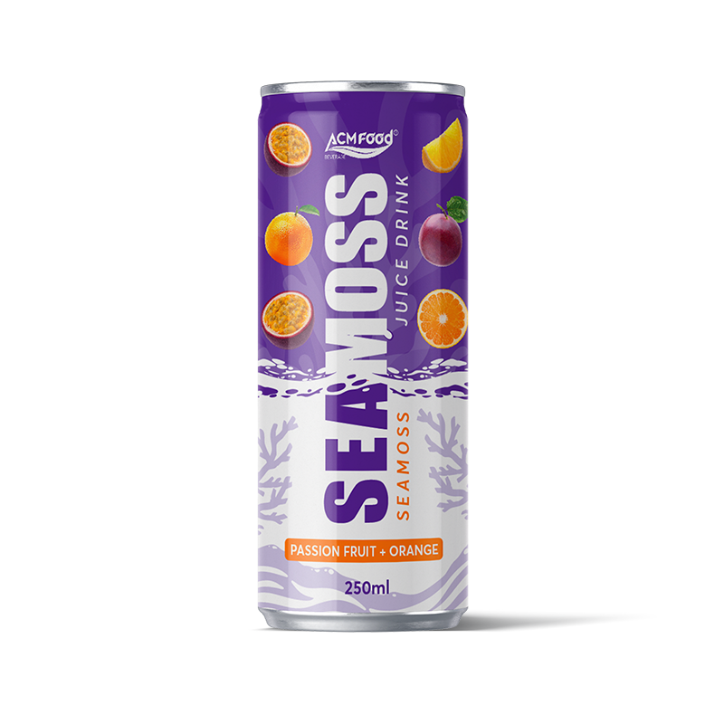 Export-ready sea moss juice blend with passion fruit and orange in 250ml alu-cans. Functional beverage solution for international distributors seeking innovative, market-differentiating products with scalable OEM capabilities.