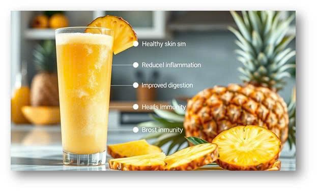 Pineapple juice benefits female health in numerous ways, particularly related to skincare, hormonal health, and reproductive wellness. The high vitamin C content helps in collagen production, resulting in healthier, more radiant skin. It also contains manganese, essential for bone health and metabolic processes, which are vital for women, especially as they age and become more prone to osteoporosis. For women with hormonal fluctuations or menstrual discomfort, bromelain’s anti-inflammatory effects can help alleviate menstrual cramps and bloating, enhancing daily comfort.