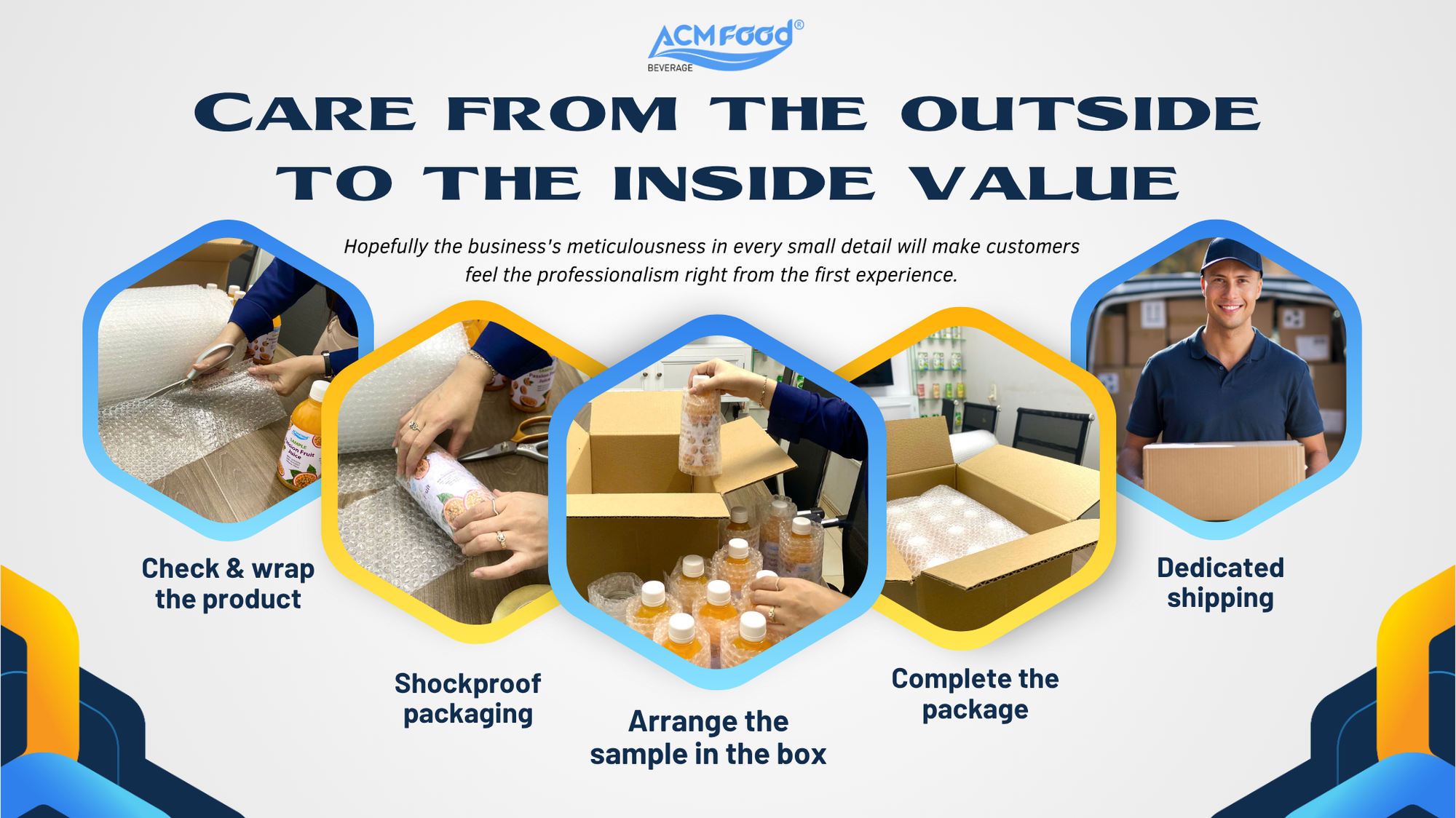 In today’s business environment, sending product samples to customers is not just a testing step; it’s a measure of a business’s credibility and quality. Before entering into a formal contract, customers are often concerned with flavor, packaging, design, and price. Therefore, ACM always focuses on the professional preparation and dispatch of samples, which helps the business demonstrate respect and dedication, while simultaneously building lasting trust with partners.